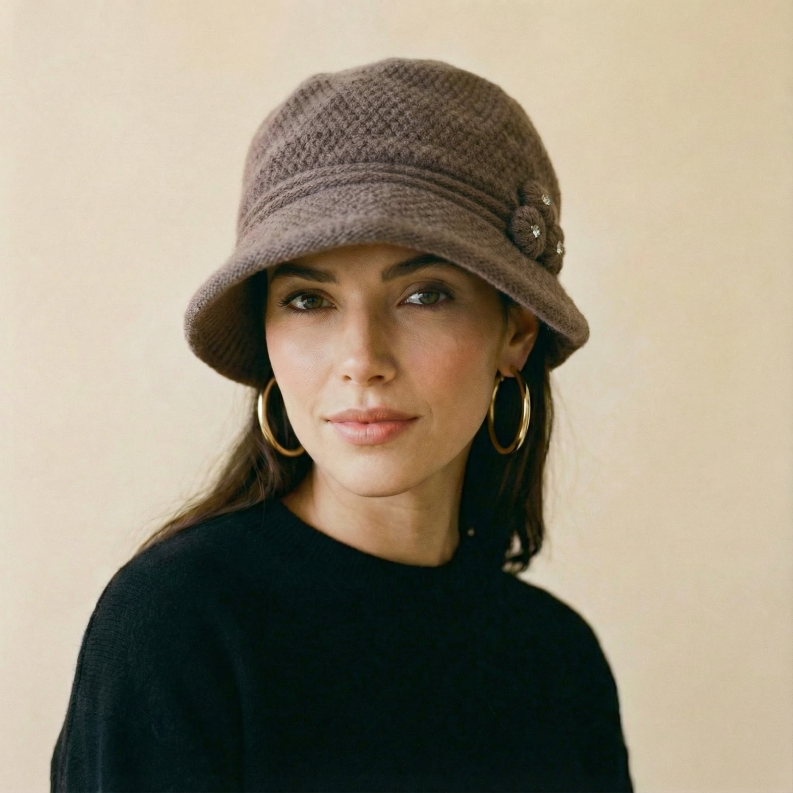 Caciula stil palarie bej inchis cu bor si decoratiune laterala argintie, captusita in interior Talie unica