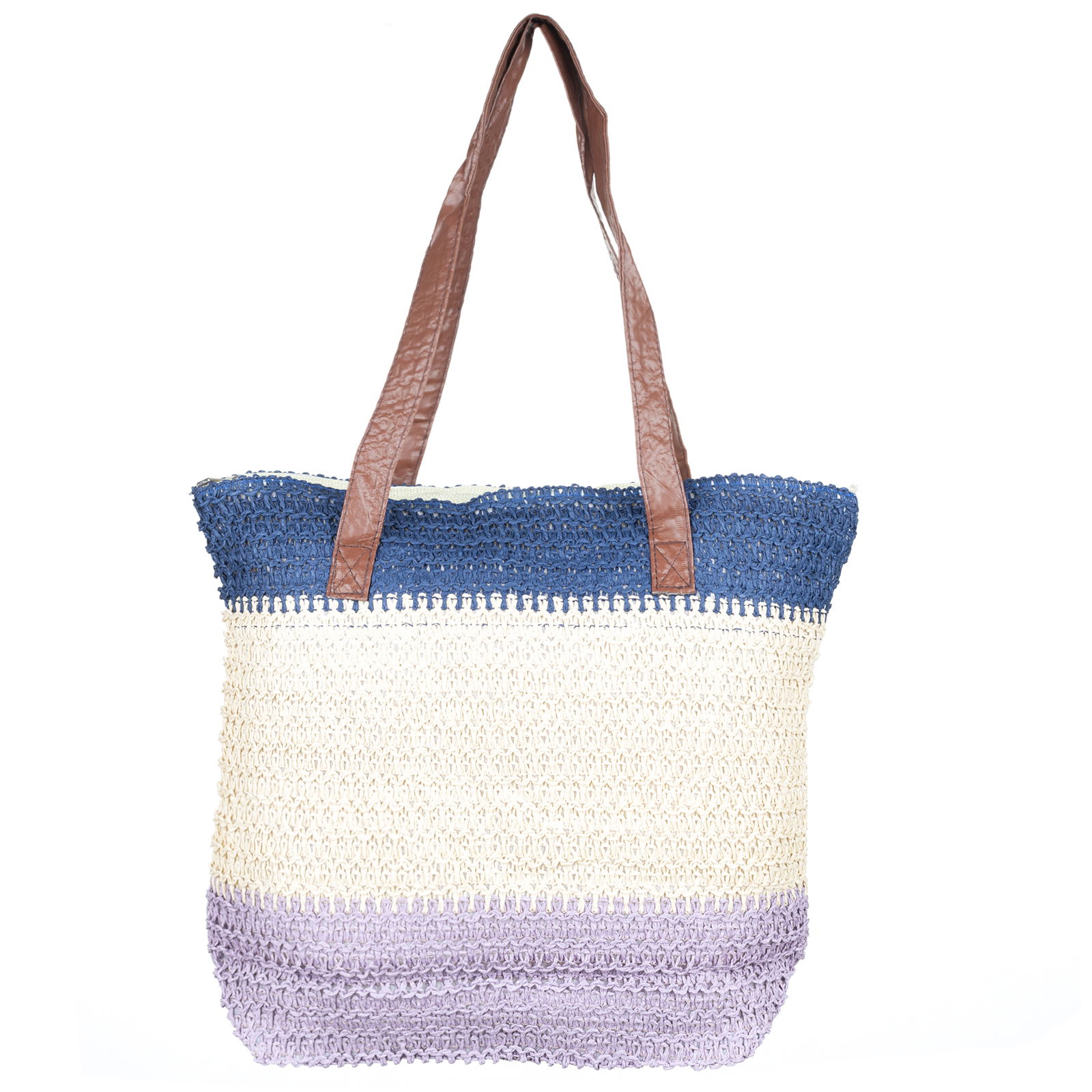Geanta shopper tricolora impletita, lila, bej si albastru