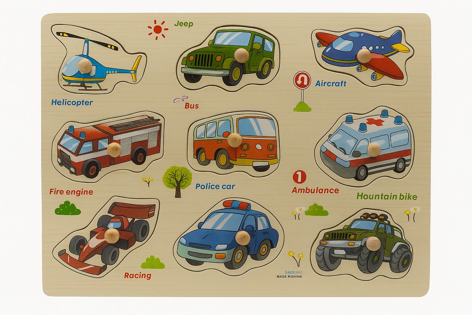 Puzzle din Lemn Educativ pentru Copii - Modele Diverse Dinozauri si Vehicule, 22x17.5cm
