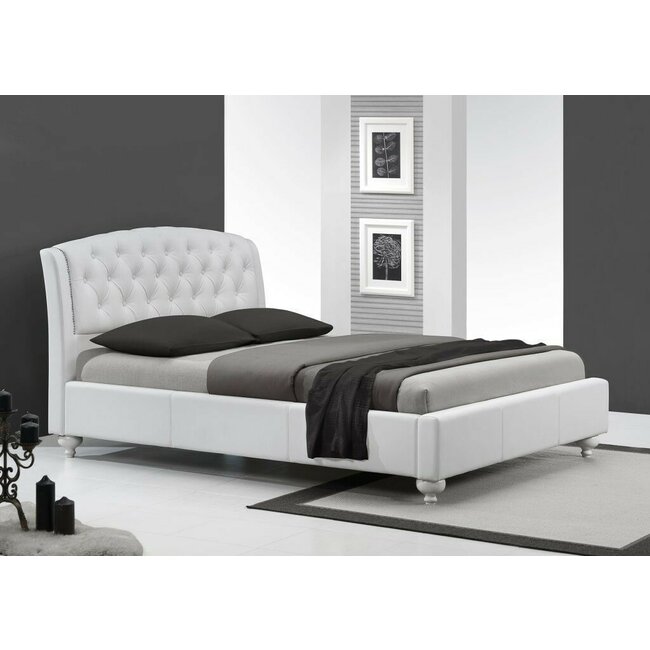 Pat Sofia, cadru solid, piele ecologică și lemn masiv, 160x200 cm, alb