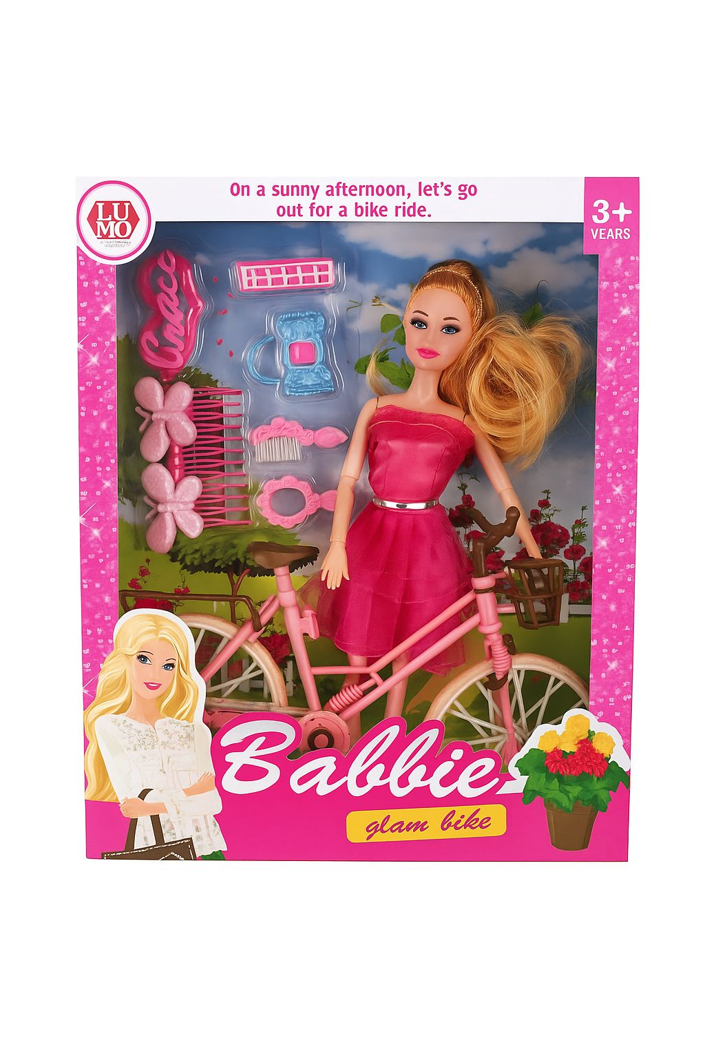 Papusa Babbie Glam Bike cu bicicleta roz si accesorii de frumusete, LUMO,32x26cm, 3+ ani